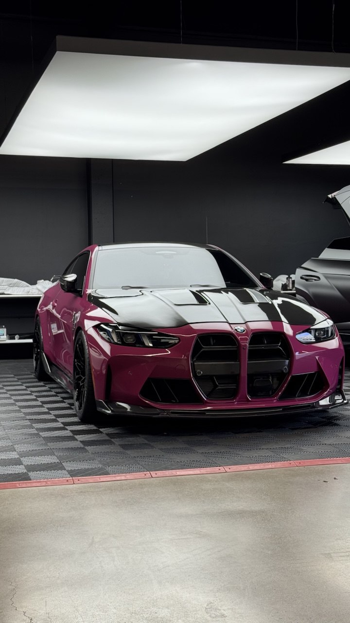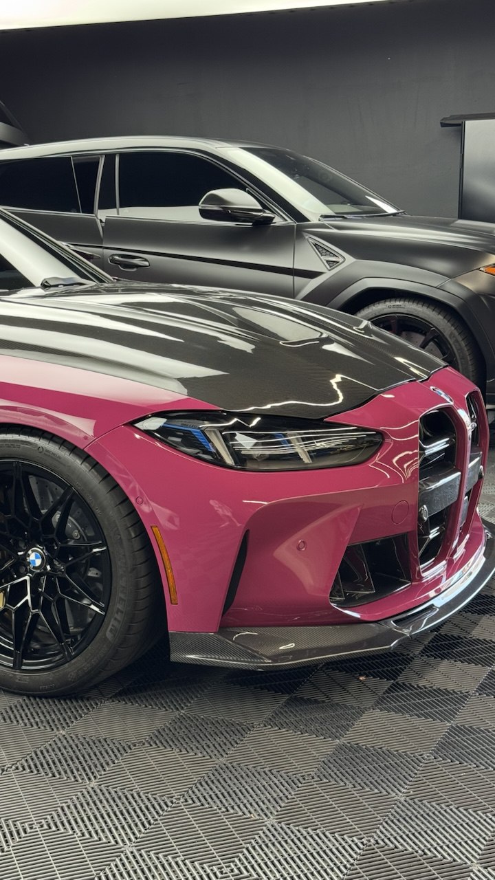 The vehicle received a full satin magenta wrap paired with high-gloss carbon detailing for a bold yet refined contrast.